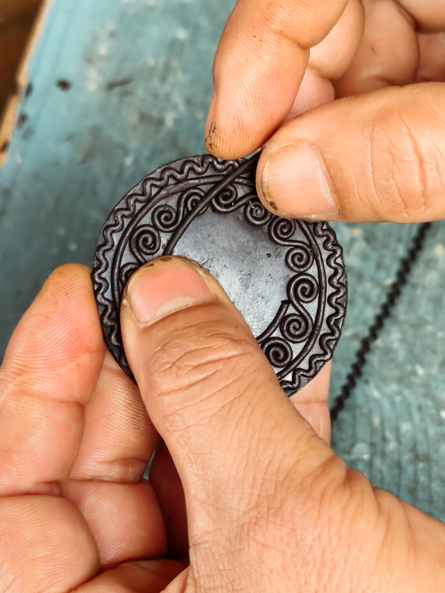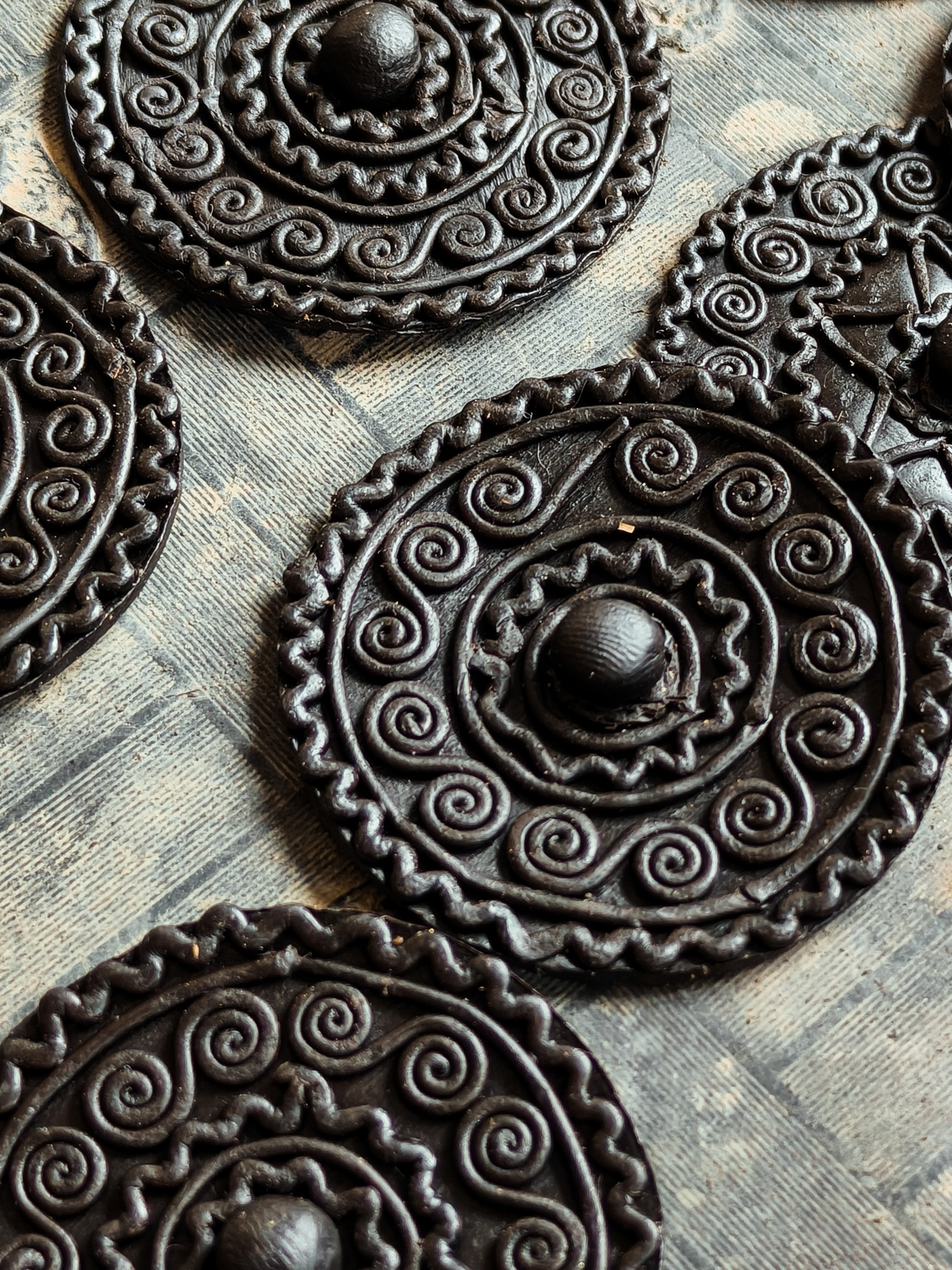 Alongside weaving, brass casting is another craft deeply tied to Tboli heritage. Artisans transform upcycled brass and other metal scraps into intricate ornaments, with symbols inspired by nature and community life: Fern leaves for forests, zigzag lines for mountains, and small circles for the gongs that call the village to gather.